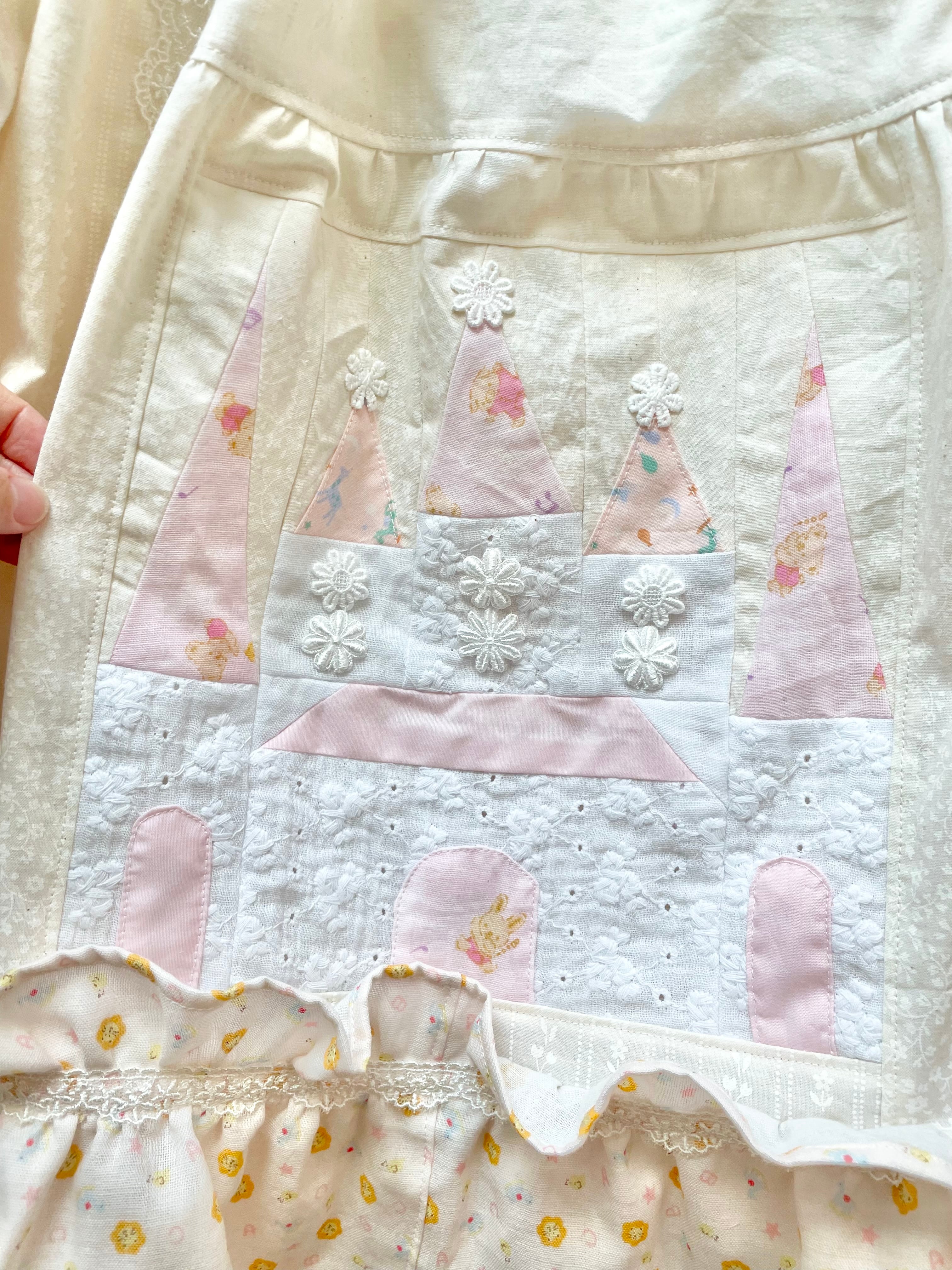 前にも後ろにも、手縫いのきらきら装飾とお城のパッチワークを1つずつ✧*。